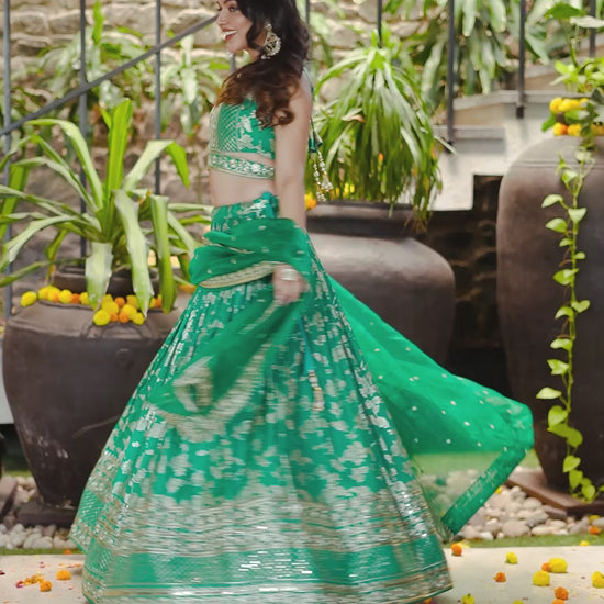 “A stunning Rama Green embroidered lehenga choli with dupatta, perfect for weddings, parties, and festive occasions.”